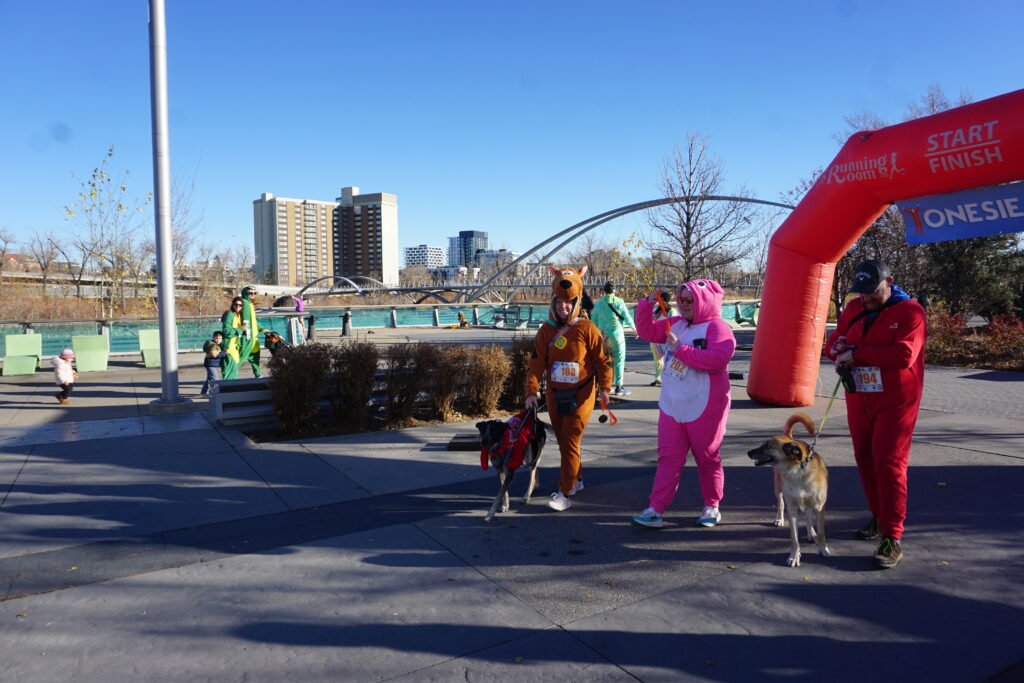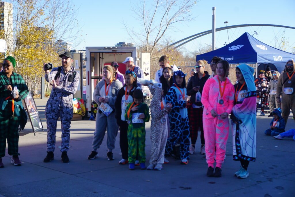 Alt Text: Participants in colorful onesies smiling and posing during a Calgary charity run event.